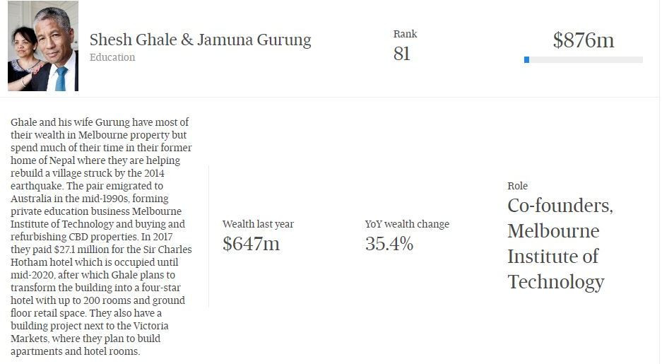 अष्ट्रेलियाका धनीहरुको सूचीमा घले ८६औं र गुरुङ ८५ औं स्थानमा छन् । यो वर्ष मात्र घले दम्पत्तीको सप्मत्ती २३ करोड डलर थप भएको छ । योसागै उनीहरुले अष्ट्रेलियाका अर्बपतिहरुको सूचीमा परेका छन् ।